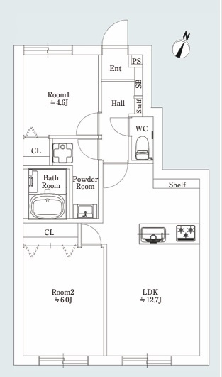 | 間取 | 2LDK (洋室4.6帖、和室6帖、LDK12.7帖) | ||