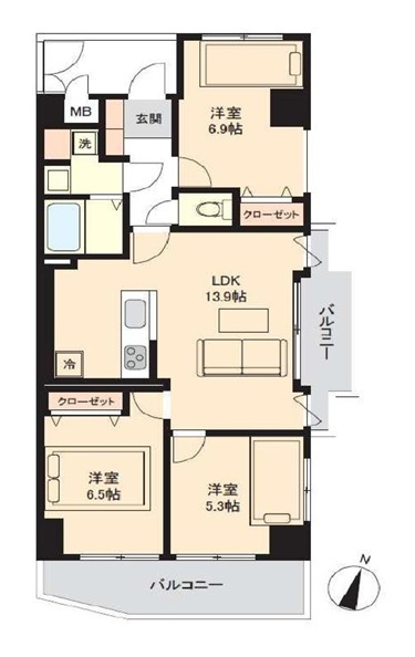 | 間取 | 3LDK (洋室6.9帖、洋室6.5帖、洋室5.3帖、LDK13.9帖) | ||